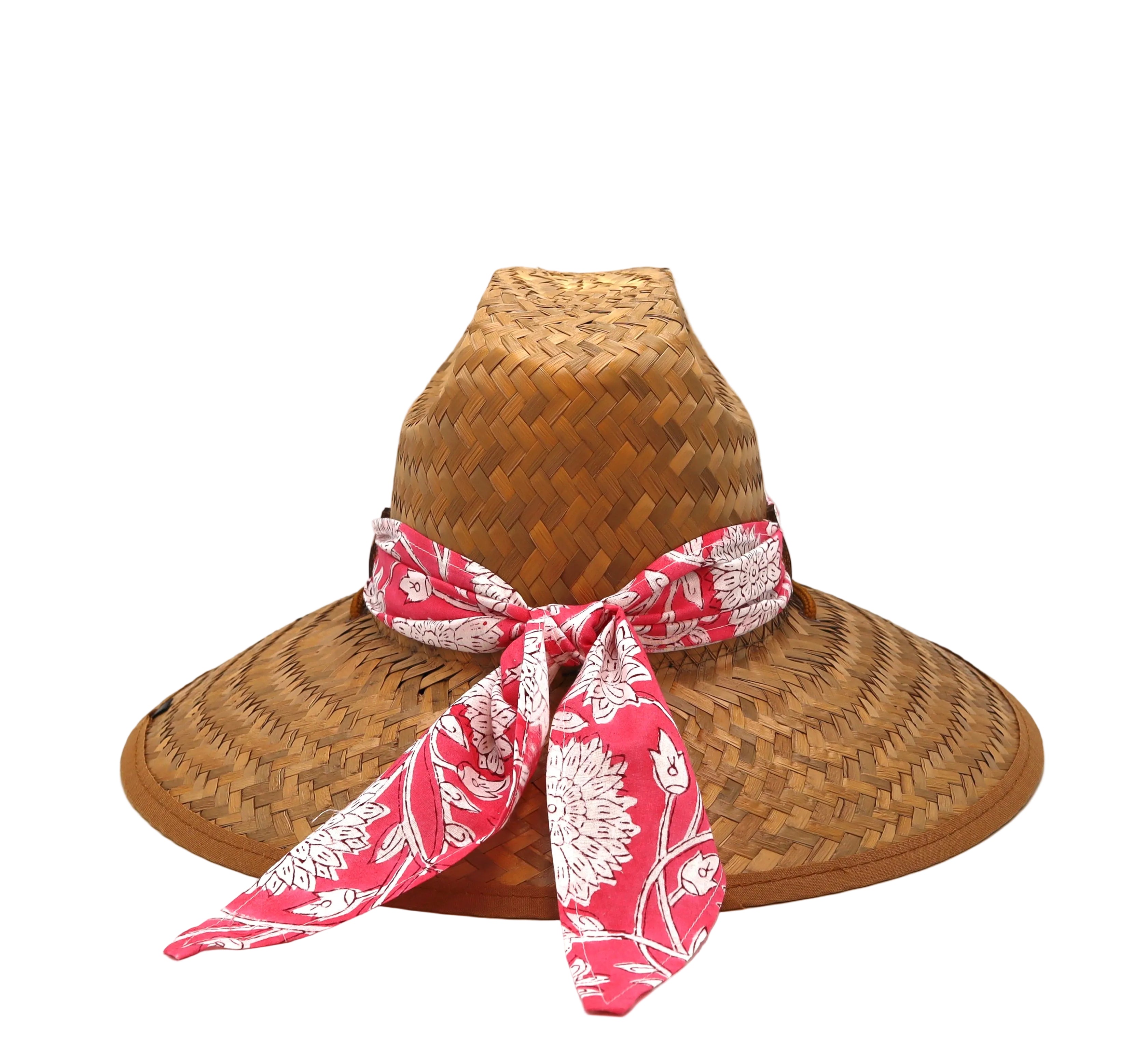 STRAW HAT - PINK FLOWER PRINT SCARF WITH LEATHER DETAIL